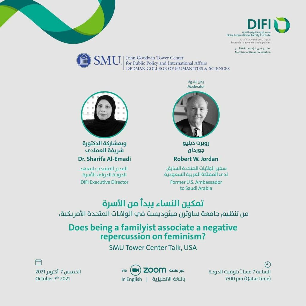 Dr. Sharifa Noaman Al-Emadi, Executive Director at Doha International Family Institute (DIFI), participated in an international panel discussion entitled “ “Does being a familyist associate negative repercussions on feminism” organized by Southern Methodist University (SMU) Dedman College of Humanities and Sciences . she indicated that applying policies supportive of the family enhances female empowerment at the economic, social and health levels, as well as strengthens their presence in the labor market system.